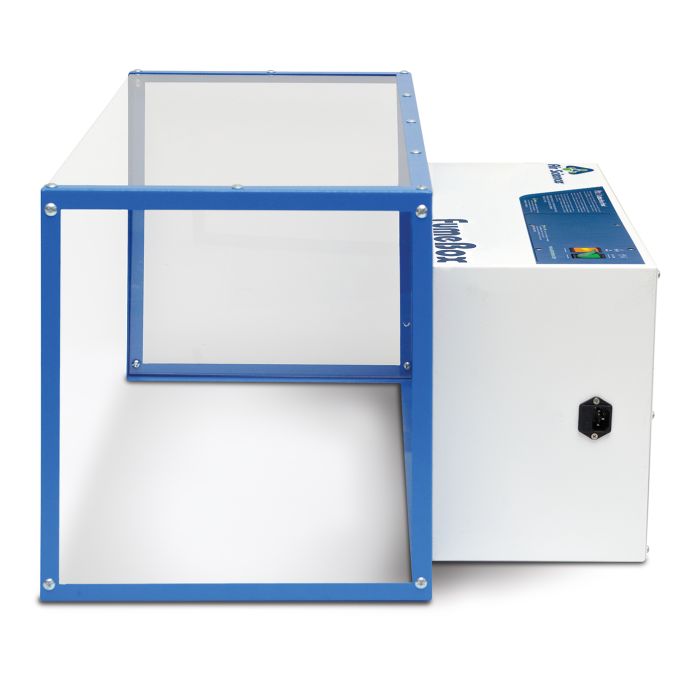 Finish: White epoxy-coated steel filtration unit with blue enclosure. Clear sides and top panels.