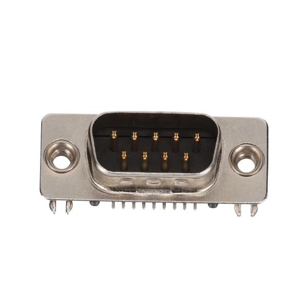 Amphenol Commercial Products G17DC0911231EU High Density D-Sub Connectors Dsub R/A Dip, 9 Position Plug, Sunk 4.27mm, 10u" Au, Footprint 1.6mm, Single Row, Post distance 1.4mm, PCB hole distance 2.3mm, Tail 2.5mm, Tray, Black, PA9T, Terminal Brass