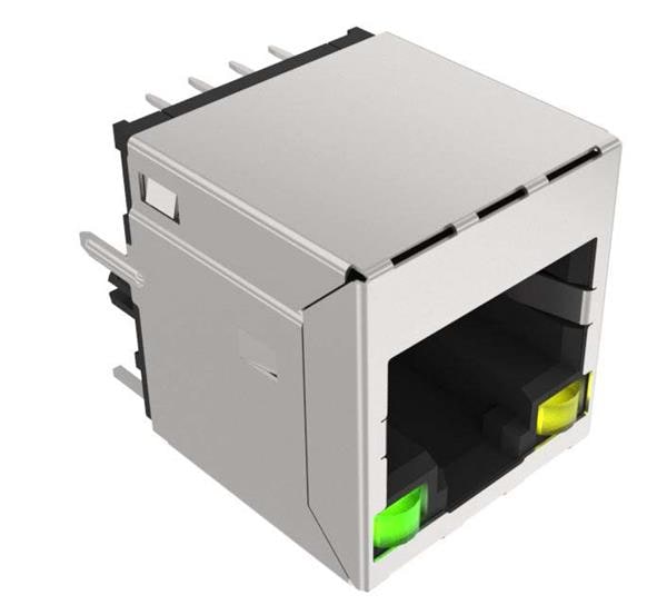 Amphenol Commercial Products RJE441882411 Connectors 8P8C, High Speed Vertical, Through Hole Mount, CAT5E, Shield without EMI Tabs, With Green and Yellow LED