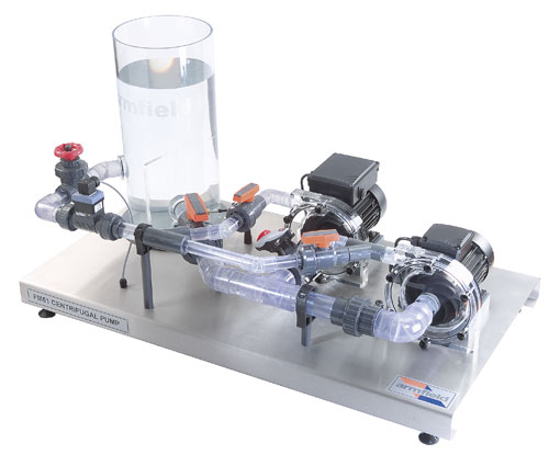A small-scale series/parallel pump demonstration unit, comprising of a water reservoir, two pumps, control valves and interconnecting pipework, all mounted on a stainless steel base.