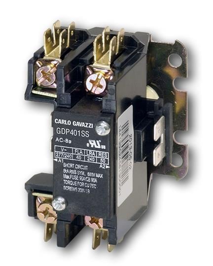 Carlo Gavazzi GDP401SS480V Industrial Relays Two-pole Definite Purpose style, 40Amps rated (FLA at 240VAC) contactor with screw terminals, 480 VAC coil. One pole is being switched while the other pole is a pass through.