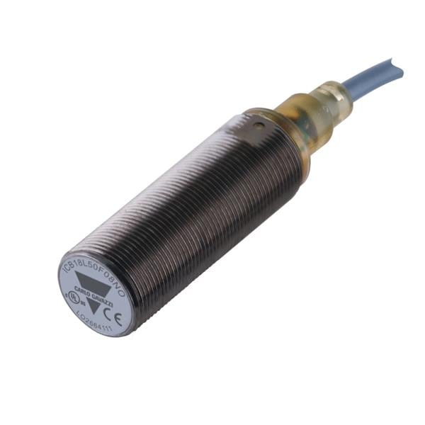 Carlo Gavazzi ICB18L50F05NC Proximity Sensors Inductive proximity sensor, M18 Nickel-Plated Brass, 2m cable, Sn 5mm, Flush mount, Long body, NPN NC output, Supply voltage 10-36Vdc, Max output current 200 mA, Max switching frequency 1,5 kHz, Operating temperature -25C - +70C, IP67