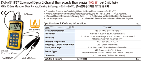 DaiHan T9234T IP67 Waterproof Digital 2-Channel Thermocouple Thermometer | EMIN.ASIA