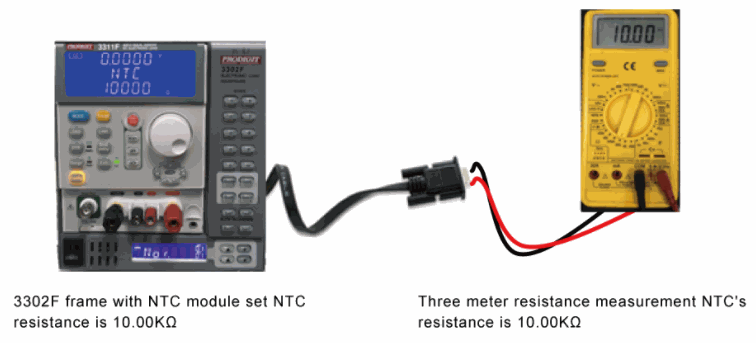 Set the NTC resistance value to 10 Kohm. The NTC output for the DSUB-15PIN connector is located on the rear panel of 3302F electronic load chassis. Use a DMM meter to measure the resistance value between PIN9 and PIN11 at both ends of the DSUB-15PIN connector. The set value is shown as (Figure left) and the actual measured value is shown as (Figure right).