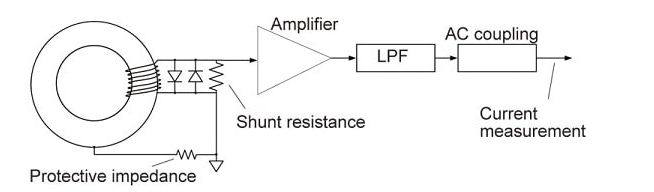 - Rogowski principle: Differentiates the output voltage waveforms at the ends of the coil, then integrates these waveforms to calculate the current value. The coreless coil reduces the size and increases the flexibility of the clamp meter.