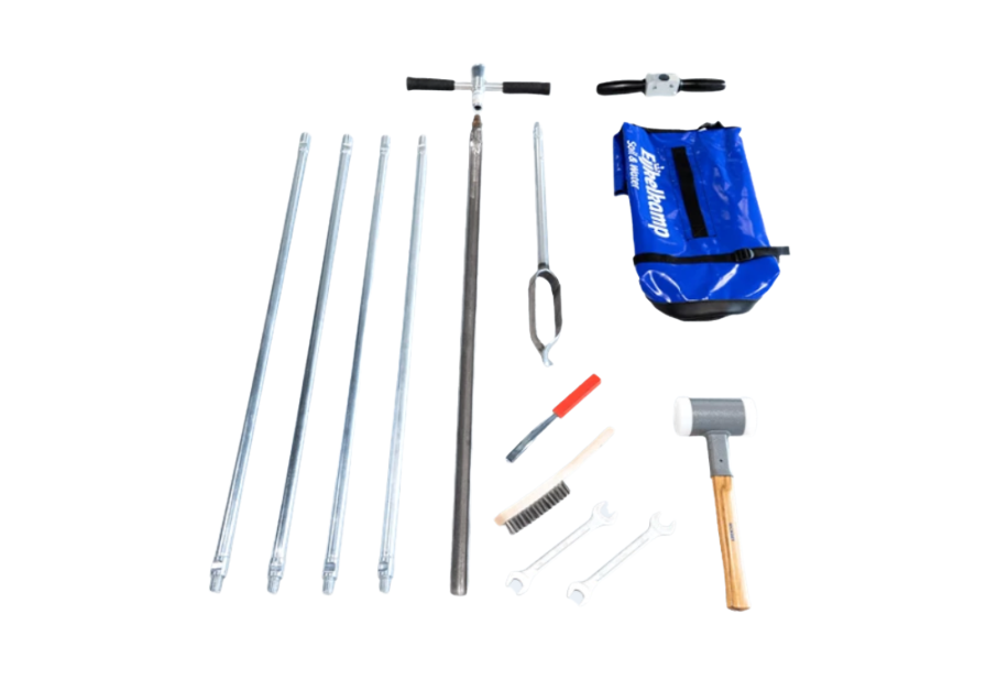 This set contains a gouge auger (heavy design) and extension rods with a conical screw thread connection, hammer with nylon heads (impact absorbing design), push-/pull handle, various accessories and a strong carrying bag for transport in the field. The set is suitable for sampling in hard soils to a depth of 5 metres.