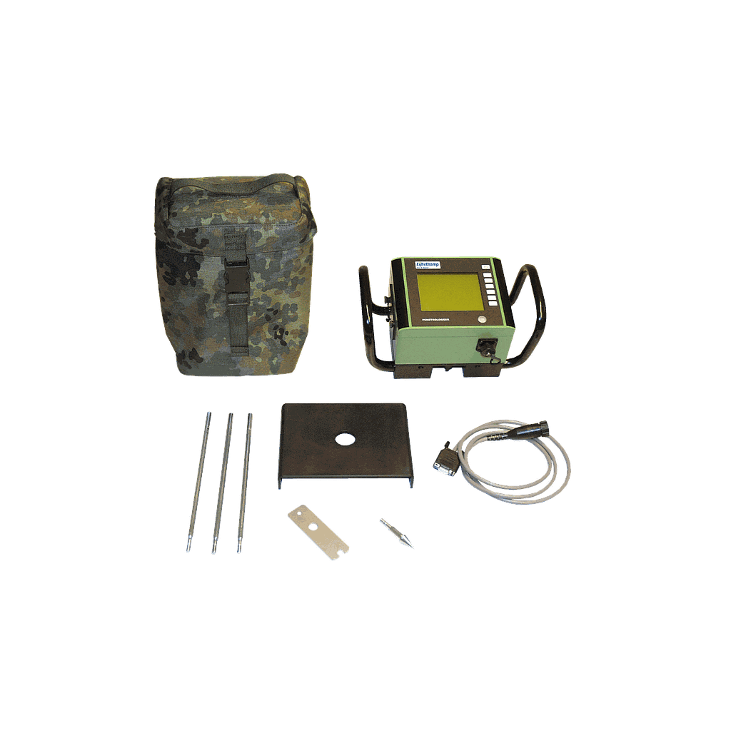 Measuring the resistance to penetration of the soil in a large number of measurements is best done with an electronic penetrometer in combination with a data logger, where the data can be saved and processed immediately in the data logger. Royal Eijkelkamp has developed an electronic penetrometer with a built-in data logger for storing and processing a large number of measurement data (1500 measurements). The camouflage coloured rucksack makes it very suitable to carry in the field.