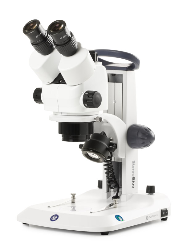 Rack and pinion stand. Maximum object height 35 mm. Supplied with black/white stage plate, transparent plate and 2 object clamps