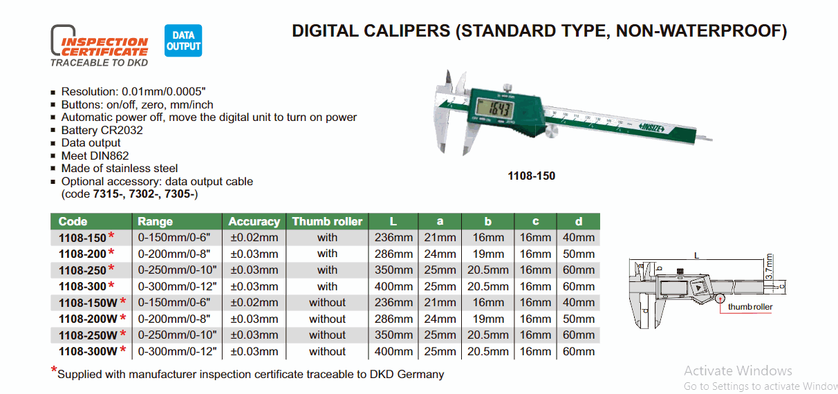 INSIZE 1108-250W Digital Caliper (0~250mm; standard model; without thumb roller) | EMIN.ASIA
