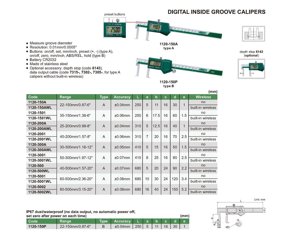 INSIZE 1120-150P Digital Inside Groove Caliper (22-150mm/0.87-6"; ±0.04mm; 0.01mm/0.0005") | EMIN.ASIA
