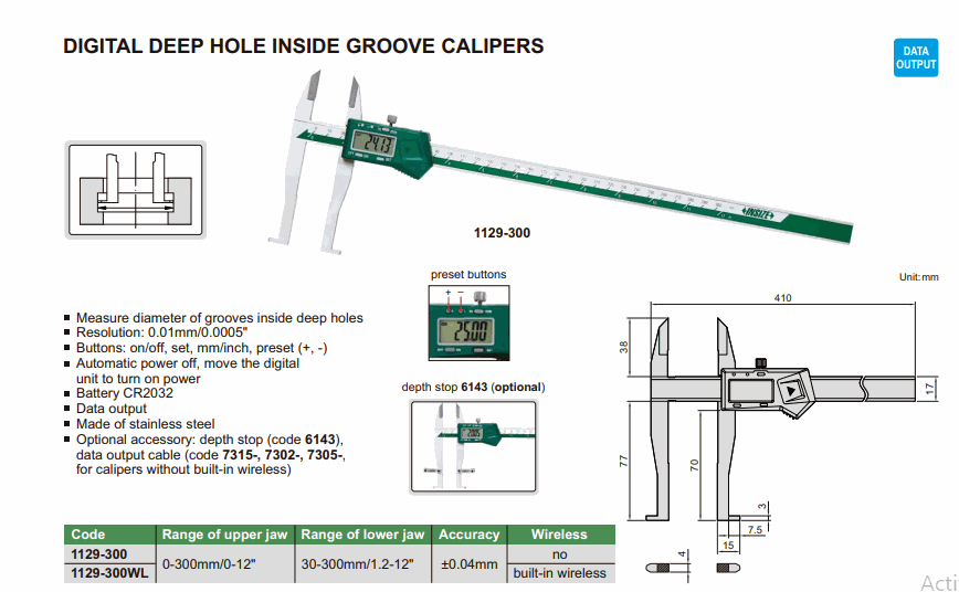 INSIZE 1129-300 Digital Deep Hole Inside Groove Caliper (0-300mm/0-12” or 30-300mm/1.2-12”; No built-in wireless) | EMIN.ASIA