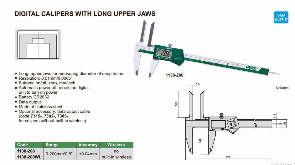 INSIZE 1138-200WL Digital Caliper With Long Upper Jaws (0-200mm/0-8”; 0.01mm/0.0005”; Built-in wireless) | EMIN.ASIA