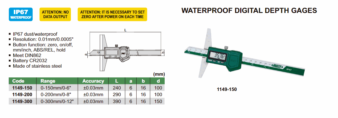 INSIZE 1149-300 Waterproof Digital Depth Gage (0~300mm) | EMIN.ASIA