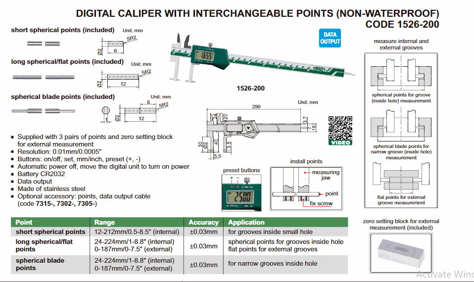 Supplied with 3 pairs of points and zero setting block for external measurement