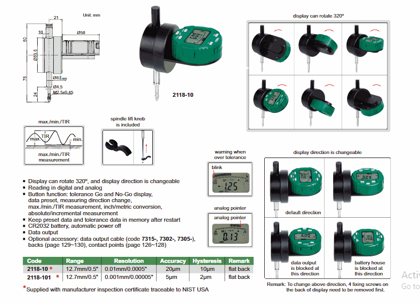 Button function: tolerance Go and No-Go display, data preset, change measuring direction, max./min./TIR measurement, inch/metric conversion, absolute/incremental measurement