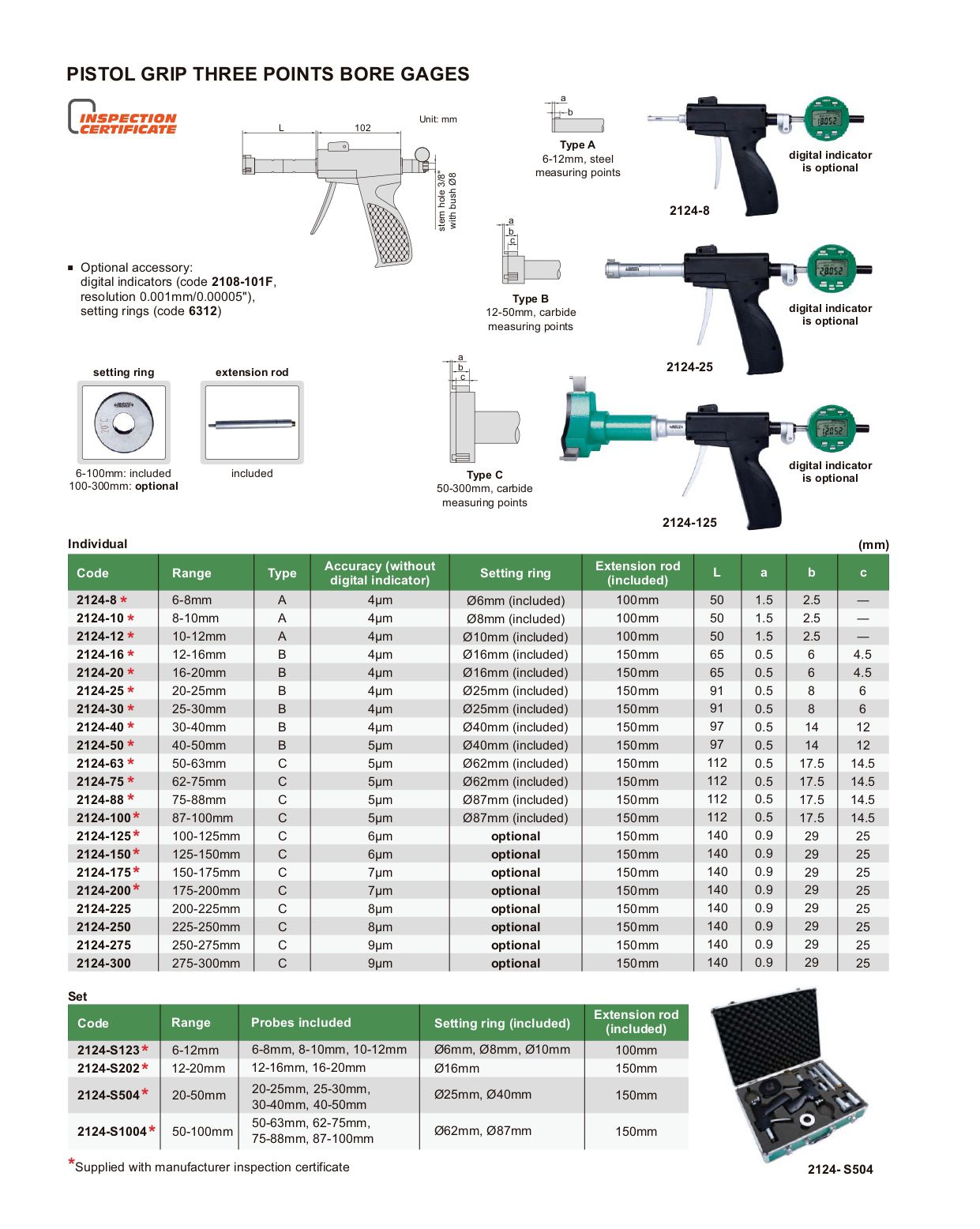 INSIZE 2124-275 Pistol Grip Three Points Bore Gage (250-275mm; Type C)