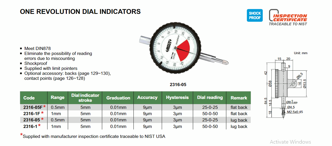 INSIZE 2316-1 One Revolution Dial Indicator (1mm; llug back) | EMIN.ASIA