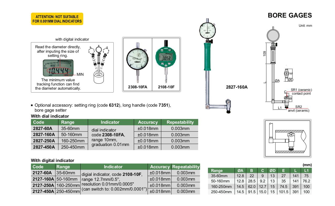 Optional accessory: setting ring (code 6312), long handle (code 7351), bore gage setter