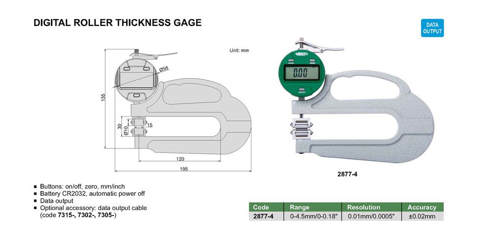 INSIZE 2877-4 Digital Roller Thickness Gage (0-4.5mm/0-0.18", ±0.02mm, 0.01mm/0.0005") | EMIN.ASIA