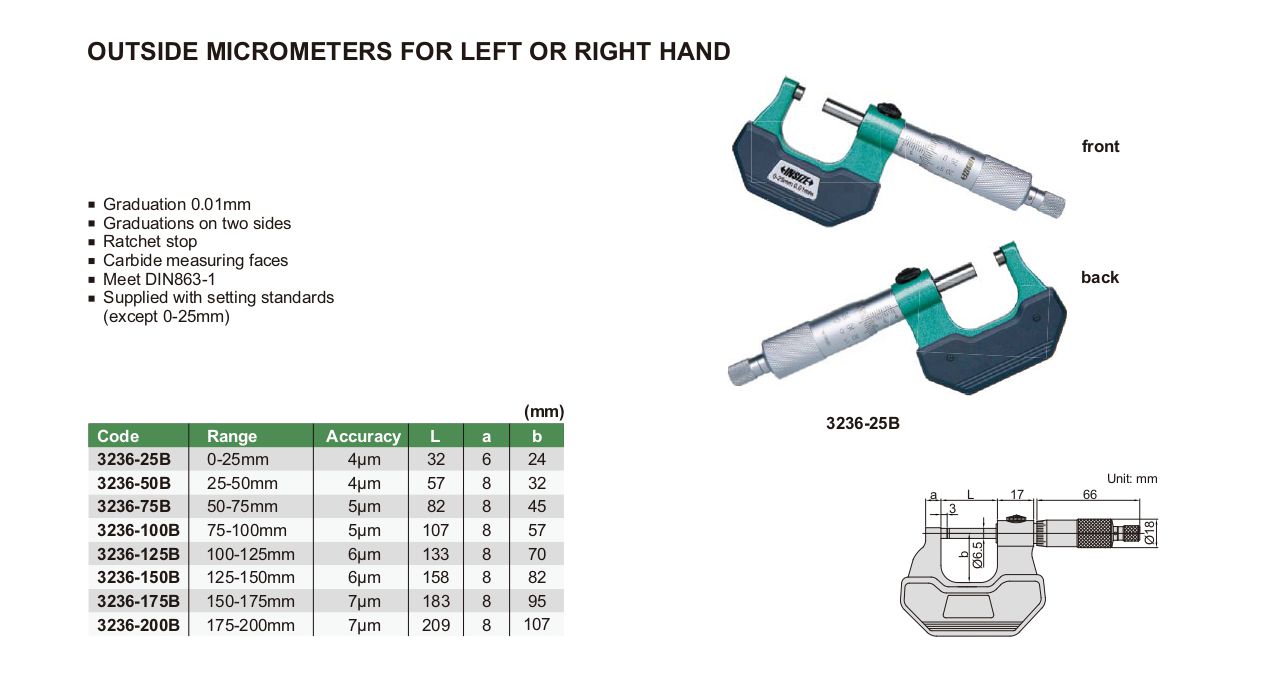 INSIZE 3236-125B Outside Micrometer For Left And Right Hand (100-125mm) | EMIN.ASIA