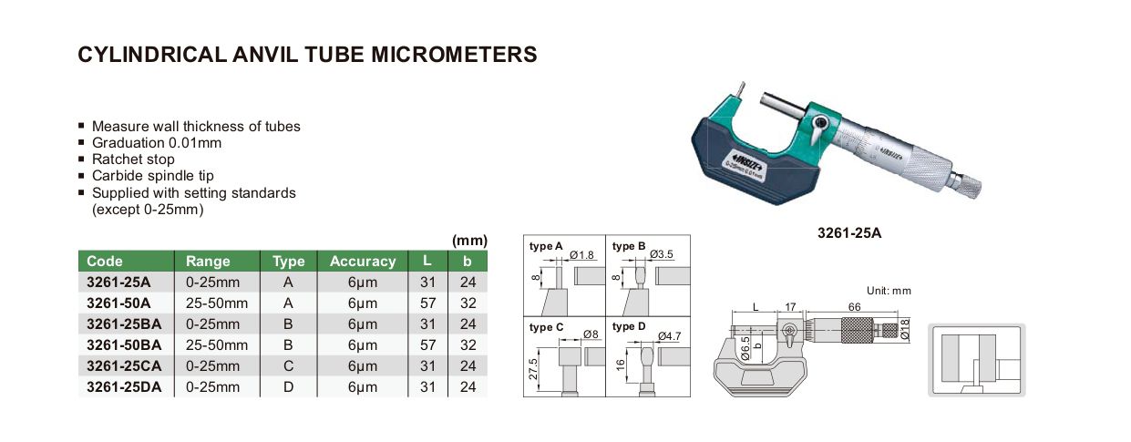 INSIZE 3261-25DA Cylindrical Anvil Tube Micrometer (0-25mm) | EMIN.ASIA