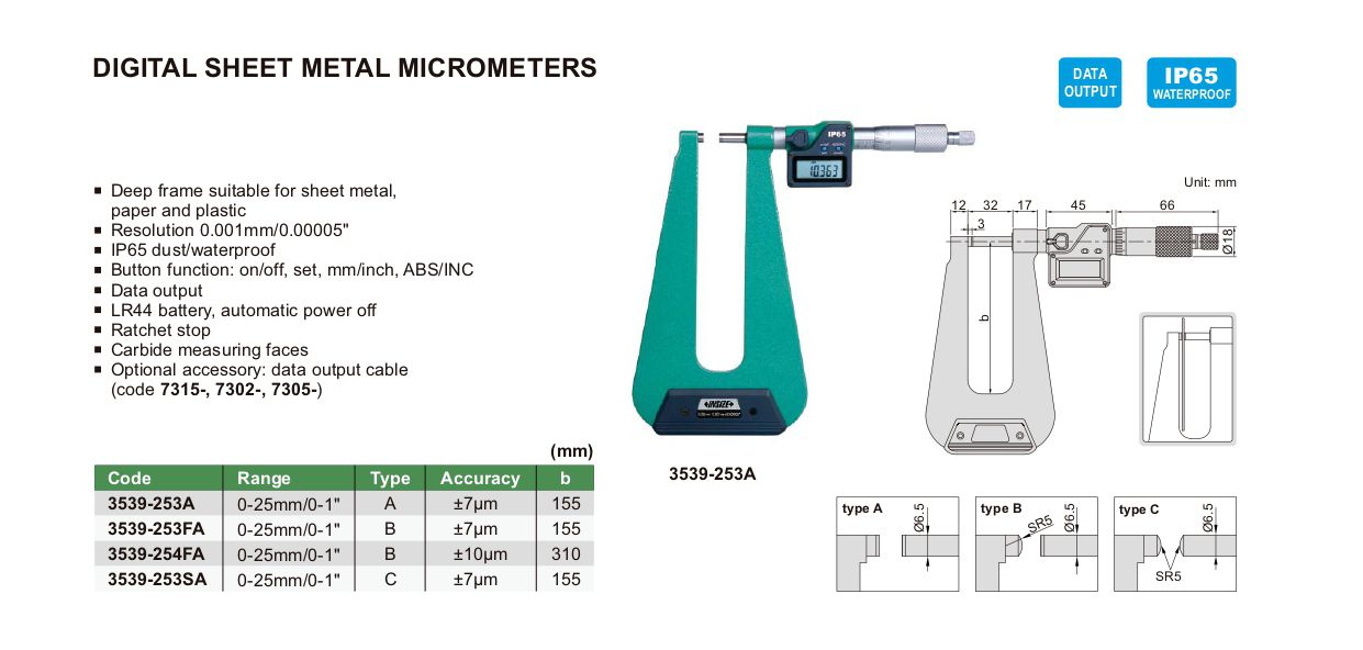 INSIZE 3539-253FA Digital Sheet Metal Micrometer (0-25mm/0-1") | EMIN.ASIA