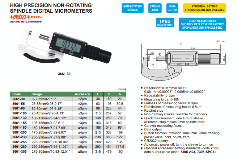 Flatness of measuring faces: 0.3 μm