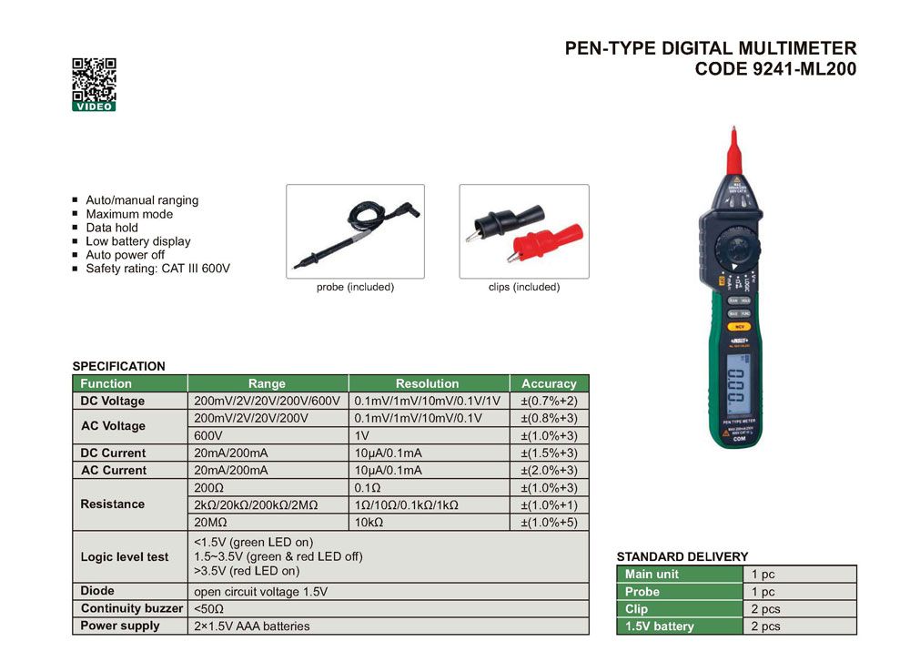 -Range: 200mV/2V/20V/200V/600V