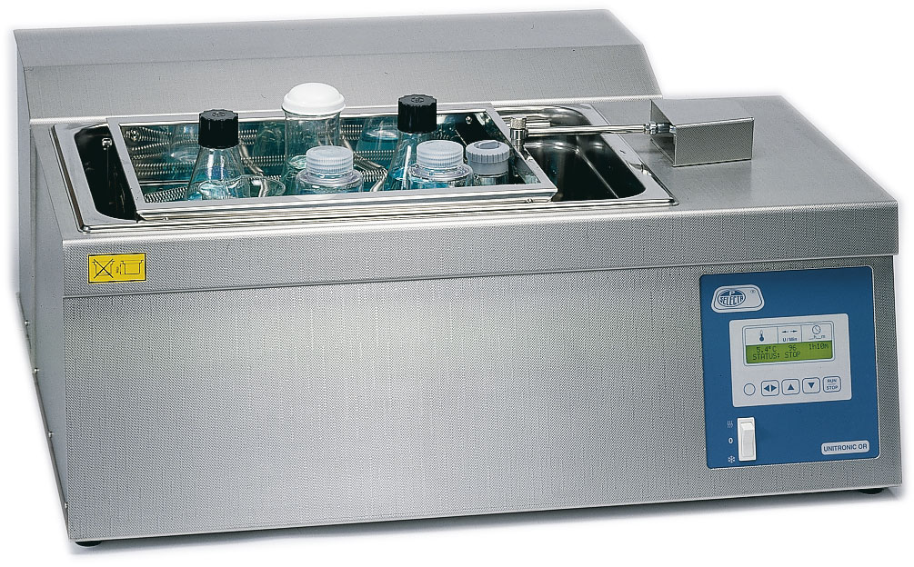 Unitronic reciprocating shaking bath linear: temperature range from ambient +5 °C to 99.9 °C.