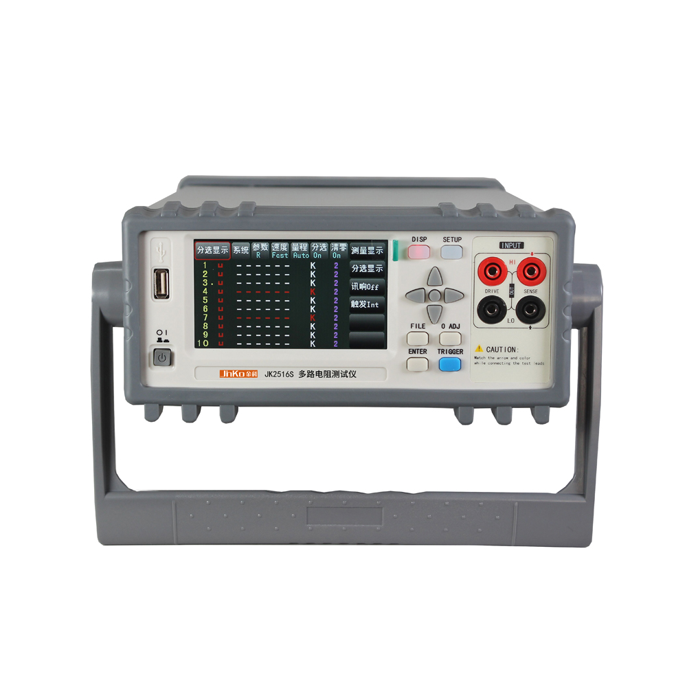 JK2516S series multi-channel resistance tester is a high-precision wide-range automatic DC resistance tester specially designed for multiple resistance testing. The instrument can measure 20 resistances at the same time and display them on the screen at the same time. The instrument has high anti-interference; each channel has an accuracy of 0.05% and a range of 10uΩ~200KΩ; the display digits are four and a half digits; the test speed can reach up to 20 times per second; the temperature compensation of the instrument avoid the influence of ambient temperature on the test work; the instrument has a very convenient sorting function, the Handler interface can output the sorting results of all channels without expansion, and can be equipped with RS232/USB/RS485 interfaces for remote control and data acquisition and analyze. The instrument is small, compact but fully functional. Through the four-terminal test method, high-speed, high-precision measurement of various high, medium and low value resistors; various switch contact resistance; relay wire package and contact resistance; transformer, inductor, motor, deflection coil winding resistance; Coil resistance, shunt resistance, series film resistance, wire resistance; metal riveting resistance of cars, ships, airplanes; DC resistance of fuses, resistors, conductive rubber, printed board lines and hole resistance. The instrument is widely used in most places such as research and development, production lines, and incoming inspection.