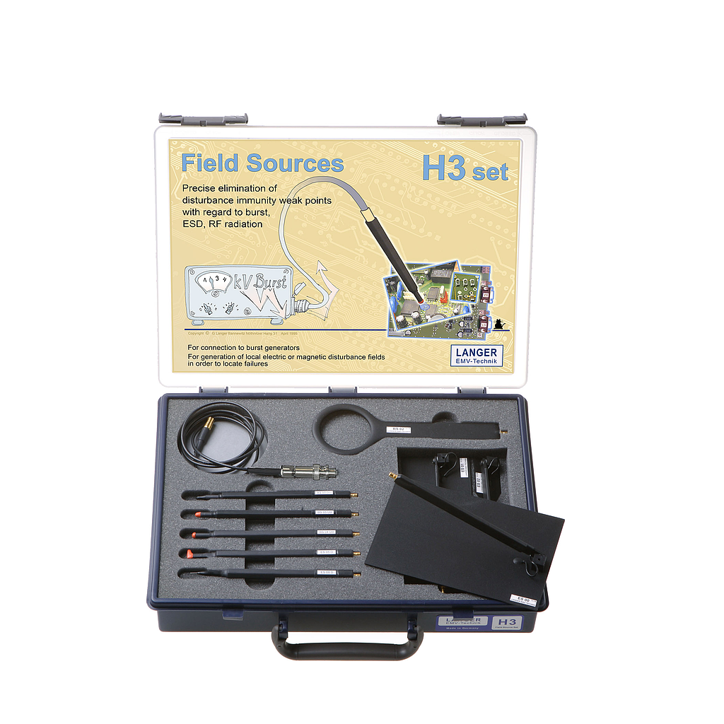 The field sources are used to analyze the immunity of assemblies and devices by coupling pulse fields (ICE 61000-4-4) into the device under test. They must be guided by hand just above the device under test. The weak spot will react to the pulse field and malfunctions will be triggered.