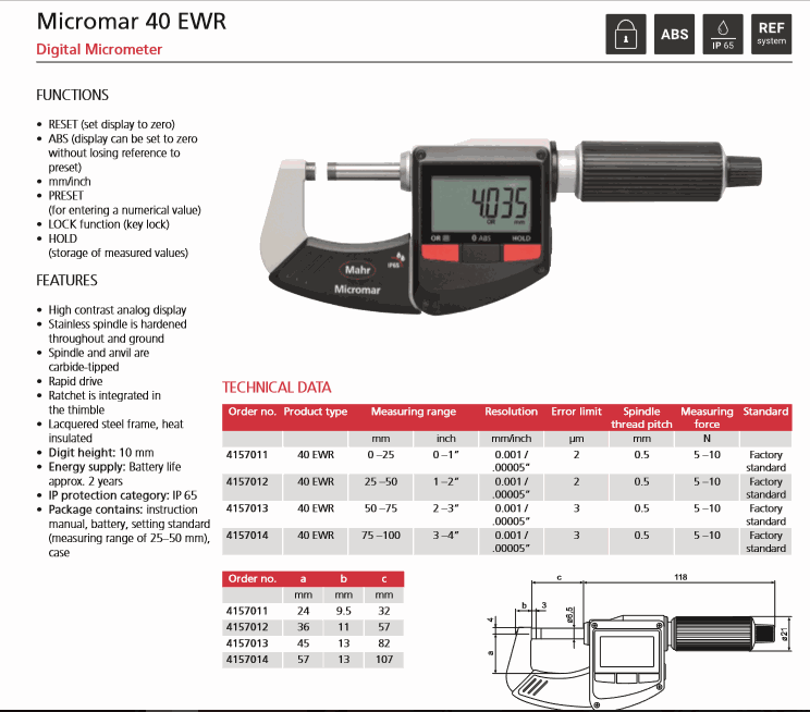 Mahr 4157011 Digital Micrometer (40 EWR, 0-25mm/0-1") | EMIN.ASIA