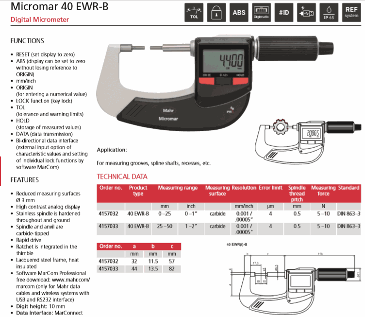Mahr 4157033 Digital Micrometer (40 EWR-B, 25-50mm/1-2") | EMIN.ASIA