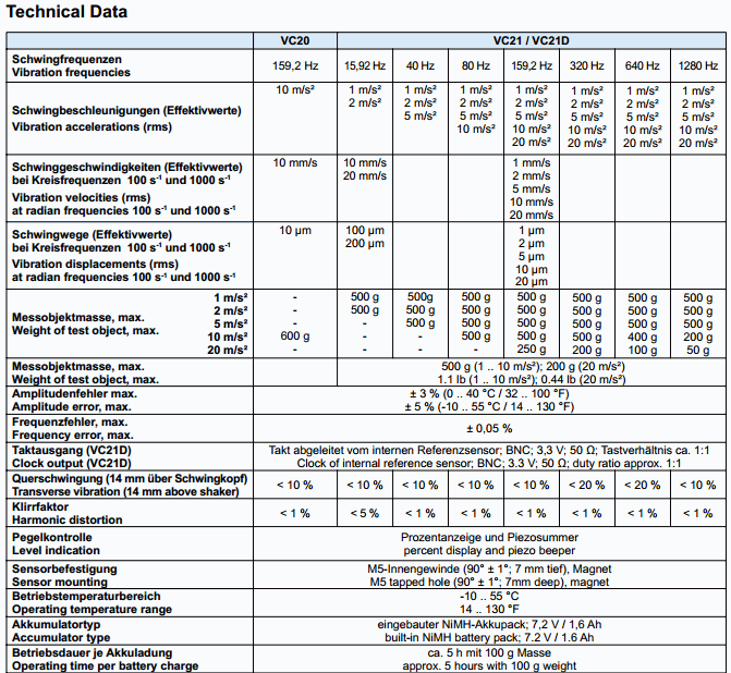 • Quartz controlled vibration frequency of 159.15 Hz (VC20) or selectable