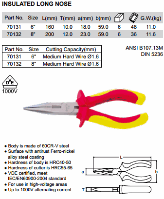 SATA 70131 Insulated Long Nose Piler (6 inch, ø1.6mm, 1000V) | EMIN.ASIA