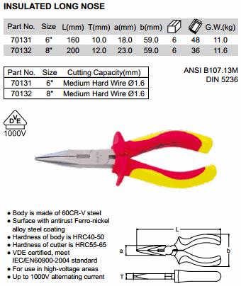 SATA 70132 INSULATED LONG NOSE PLIER 8 inch (200mm, ø1.6mm, 1000V) | EMIN.ASIA