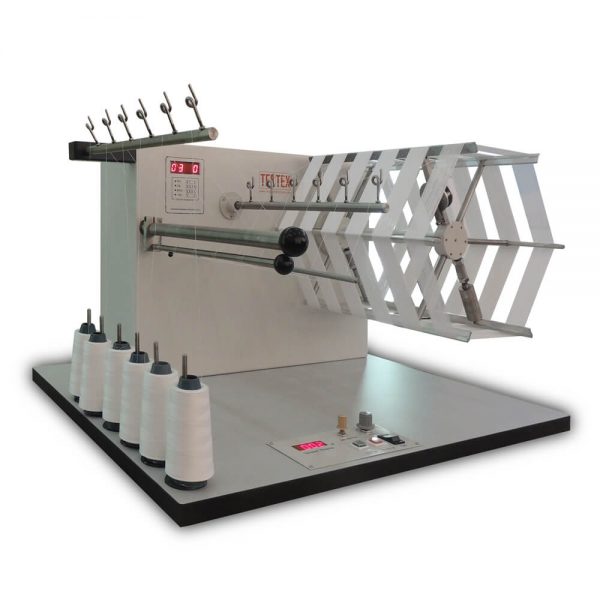 Wrap Reel Machine, to produce skeins of yarn of a pre-determined length and number of turns for count and strength testing. 1 Metre, 36″ or 54″ circumference collapsible swift (specify). Wrap reel Complete with yarn package stand and pre-tension device, fitted with pre-determined counter.