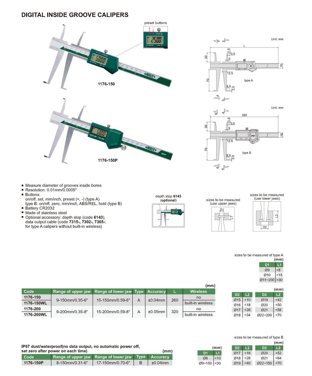 Thước cặp điện tử đo rãnh trong INSIZE 1176-200 (9-200mm/0.35-8"; 15-200mm/0.59-8"; không tích hợp không dây)